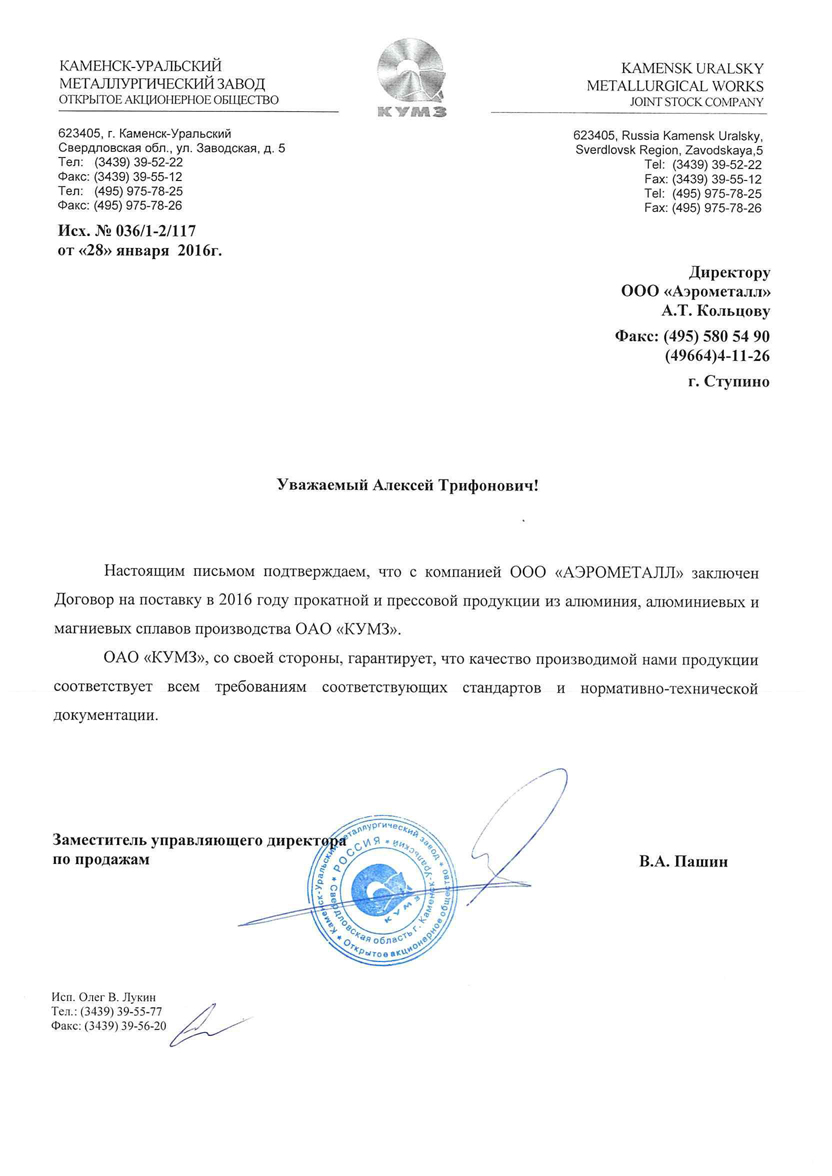 В разделе «Сертификаты» появился новый документ, подтверждающий факт заключения договора на 2016 года на поставку прокатной и прессовой продукции из алюминия и алюминиевых сплавов между ОАО «Каменск-Уральским металлургическим заводом» (ОАО «КУМЗ») и компанией ООО «Аэрометалл».